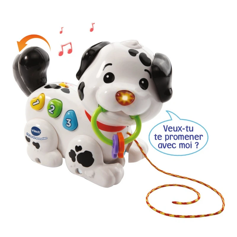En premier lieu, 1,2,3 p’tit dalmatien VTech est un jouet à tirer, qui suit votre enfant dans toutes ses déambulations dès l’âge de 1 an. En faisant rouler son fidèle compagnon, votre bout de chou peut voir s’animer les pattes, et entendre des mélodies ou sons rigolos, ainsi que des phrases enrichissant son vocabulaire.
