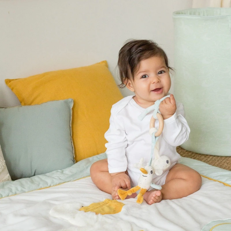 Le hochet d’éveil Au large de Nova par Trois Kilos Sept réserve aussi d’autres surprises à votre bébé, comme un joli miroir et un anneau de dentition. Pratique, il est également muni d’une attache sucette pour éviter qu’elle ne se perde !