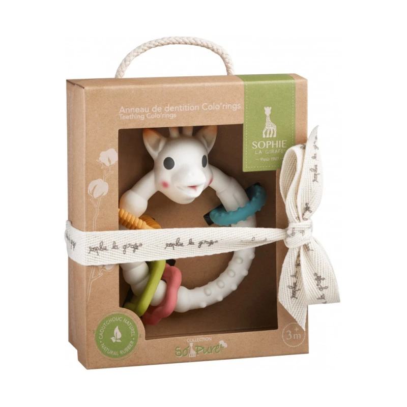 L’anneau de dentition So’Pure Sophie la girafe de Vulli est l’accessoire indispensable lors des poussées dentaires de bébé. 100% naturel, composé en caoutchou tiré de la sève de l’hévéa et de peinture alimentaire, l’anneau de dentition Colo’rings de Vulli est sans danger pour bébé et parfait pour soulager les gencives douloureuses. L’anneau de dentition Color’rings offre une multitude de parties souples à mordiller et multitexturées (picots, stries, oreilles et cornes de Sophie) pour soulager efficacement les gencives de bébé avec différentes intensités. Léger et ergonomique l’anneau de dentition Colo’rings est facile à attraper par les petites mains de bébé. Ludique, votre tout-petit sera attiré par les 4 formes géométriques et ses couleurs vives, tout ceci est follement amusant ! Livré dans une jolie boite cadeau, l’anneau de dentition Colo’rings So Pure de Vulli est le cadeau naissance parfait !