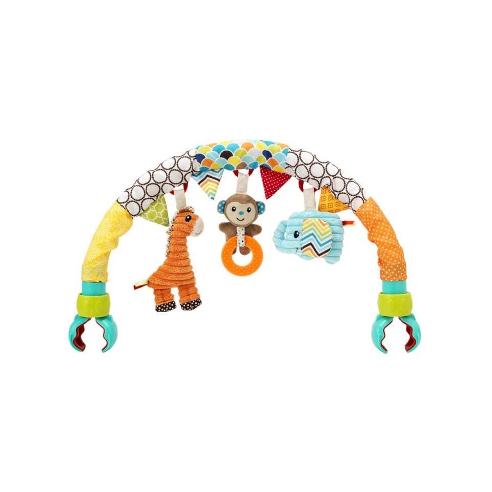 Cette arche d’éveil va divertir bébé partout où il va grâce à ses attaches universelles, qui permettent de le fixer sur les poussettes, le transat ou même les sièges bébé… Il permet à bébé de développer sa motricité. Dans les tons orangés, jaune, bleu et verts, Les 3 petits personnages en tissu tout doux et colorés encouragent bébé à regarder, attraper et à essayer de les saisir! L’élephant bleu trop craquat, le singe et la girafe sont amovibles pour encore plus d’amusement! De plus, le singe a un anneau souple à mordiller.
