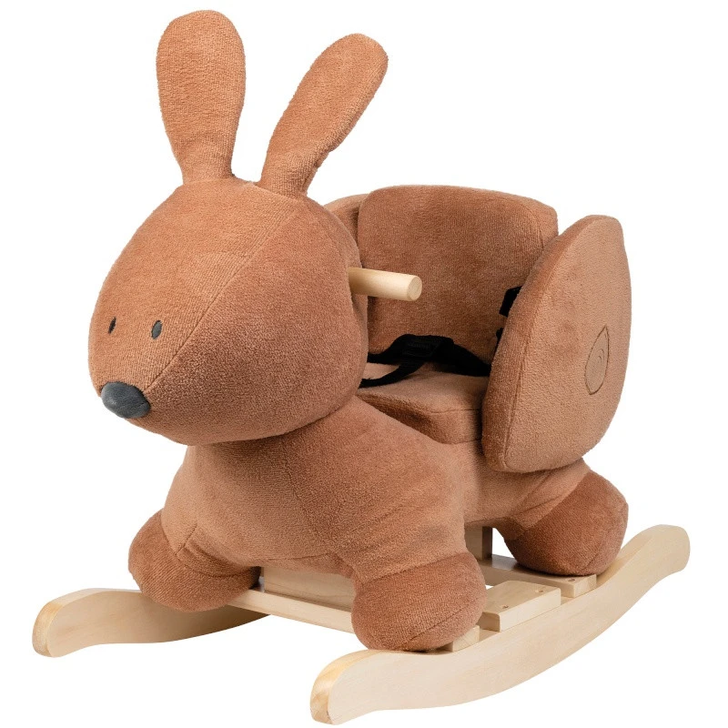 Sur un très beau socle en bois, la bascule assortie à la collection Susie et Bonnie de Nattou représente Bonnie la lapine dans un joli tissu rouille tout doux à caresser.