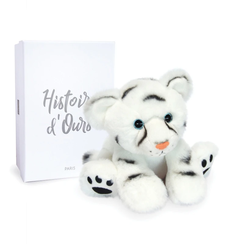 Ce bébé tigre blanc, aussi appelé tigre blanc royal, est un magnifique tigre au pelage blanc rayé de noir, aux yeux bleus et au nez rose. Attendrissant avec sa bonne bouille et ses pattes généreuses, ce petit tigre assis souple et très doux saura aussi se montrer tendre pour partager tous les instants de câlins ou pour jouer aux aventuriers !