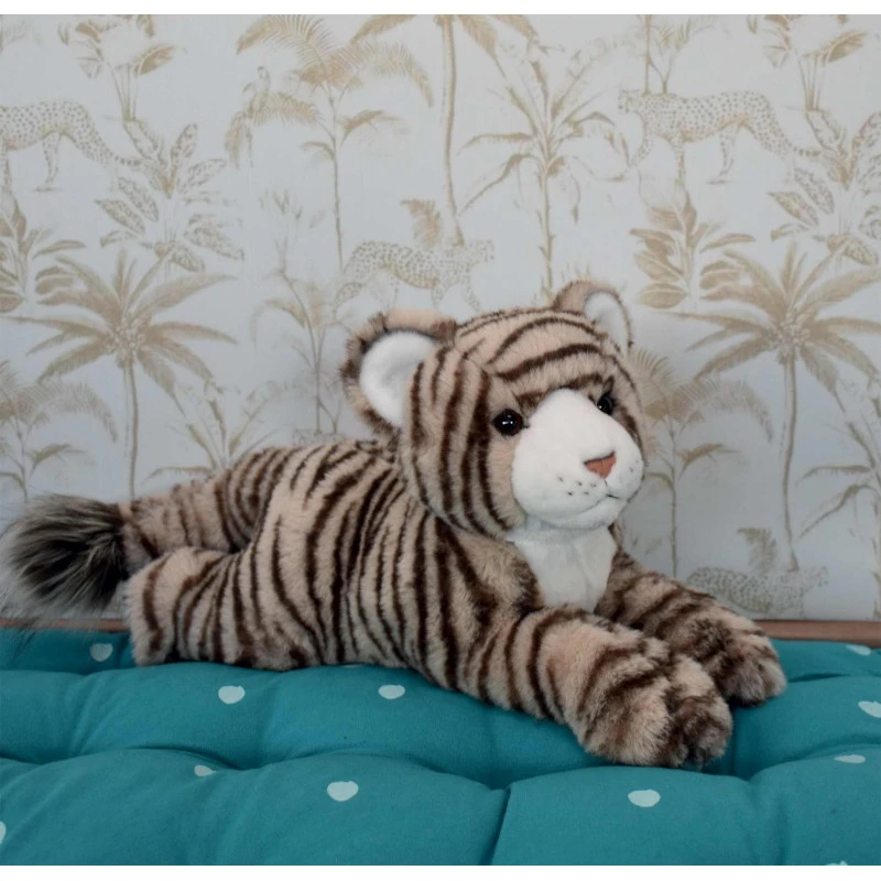 Vivant au cœur de la jungle, le tigre est presque invisible, tapi sous les arbres ou parmi les herbes sèches. Bengaly le tigre est un gentil gros chat aux rayures brun clair sur un pelage beige. Attendrissant avec sa bonne bouille et son nez rose, il est aussi très doux et facile à manipuler car très souple. Proposé en position couchée, il paisible et apaisant pour rassurer petits et grands.