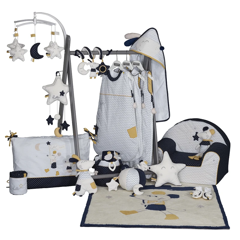 Découvrez la superbe collection Hello par Sauthon. Dans les tons de bleu marine, jaune et blanc, son adorable petite souris accompagnera bébé dans toutes ses aventures et ses plus jolis rêves. Avec un pied dans la lune et l’autre dans les étoiles, la collection Hello a tout pour plaire et plonge la chambre de votre tout petit dans son univers plein de rêves étoilés. Vous y retrouverez tous les objets nécessaires pour créer un univers cosy et confortable : Tour de lit, édredons, housse de couette, gigoteuses, pyjamas, matelas à langer, mobile, tapis d’éveil, sortie de bain, doudous et peluches… et plein d’autres articles !