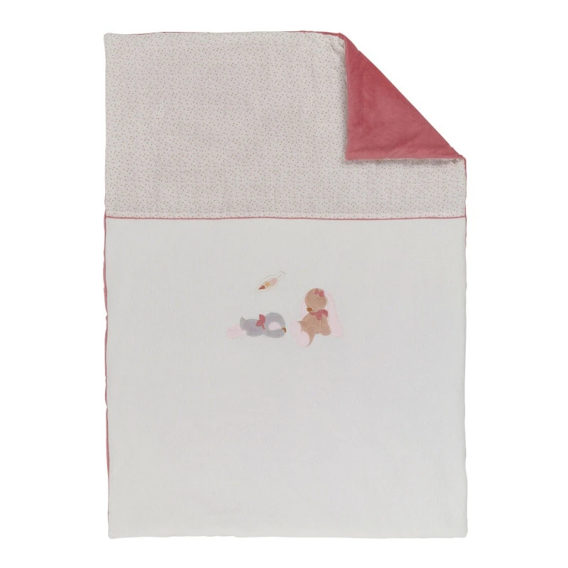 Dans les tons de rose et blanc et recouvert par de jolis motifs girly, on y aperçoit les personnages de la gamme : Sasha l’adorable pingouin et Pauline la jolie lapine qui somnolent, bien confortablement allongées !