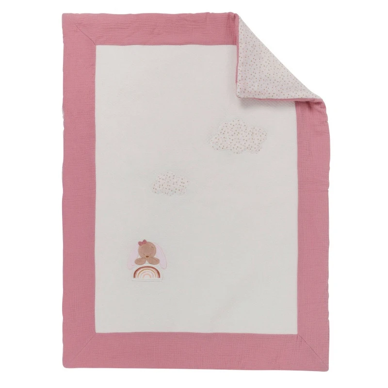 Dans les tons de blanc, elle est entourée d’un joli rose soutenu et on peut y apercevoir Pauline la jolie petite lapine qui s’amuse sur un joli arc en ciel multicolore. Trop craquante ! Elle réconfortera bébé et l’accompagnera au pays des songes.