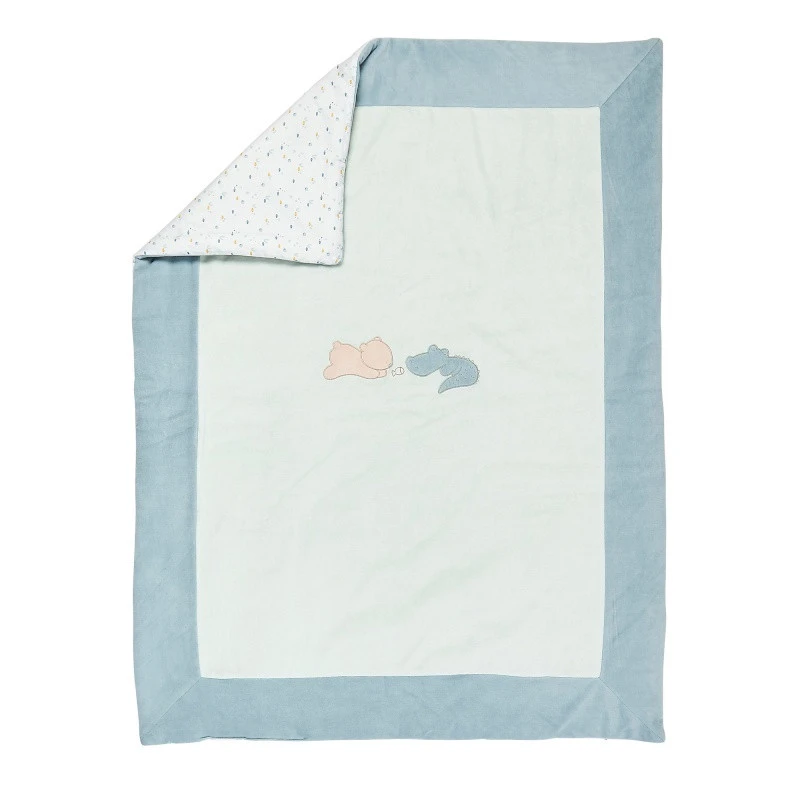 La couverture Roméo, Jules & Sally propose une face en velours de polyester vert et bleu, décorée au centre par les deux compères. L’autre face est quant à elle réalisée en popeline de coton imprimée de petits poissons ravissants.