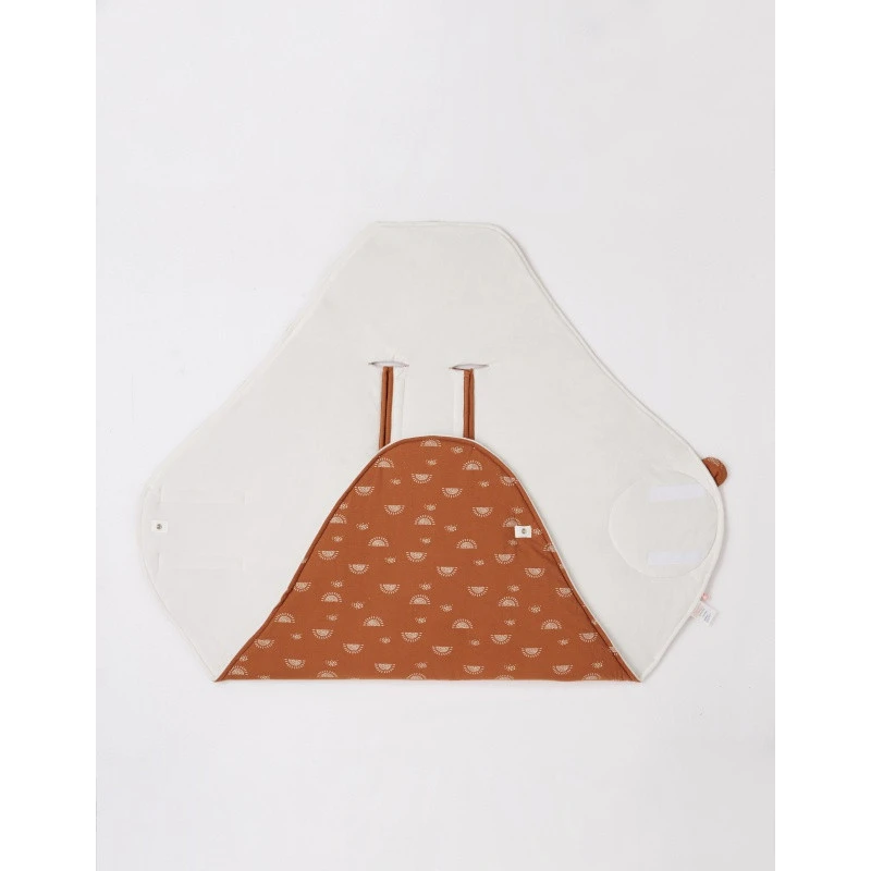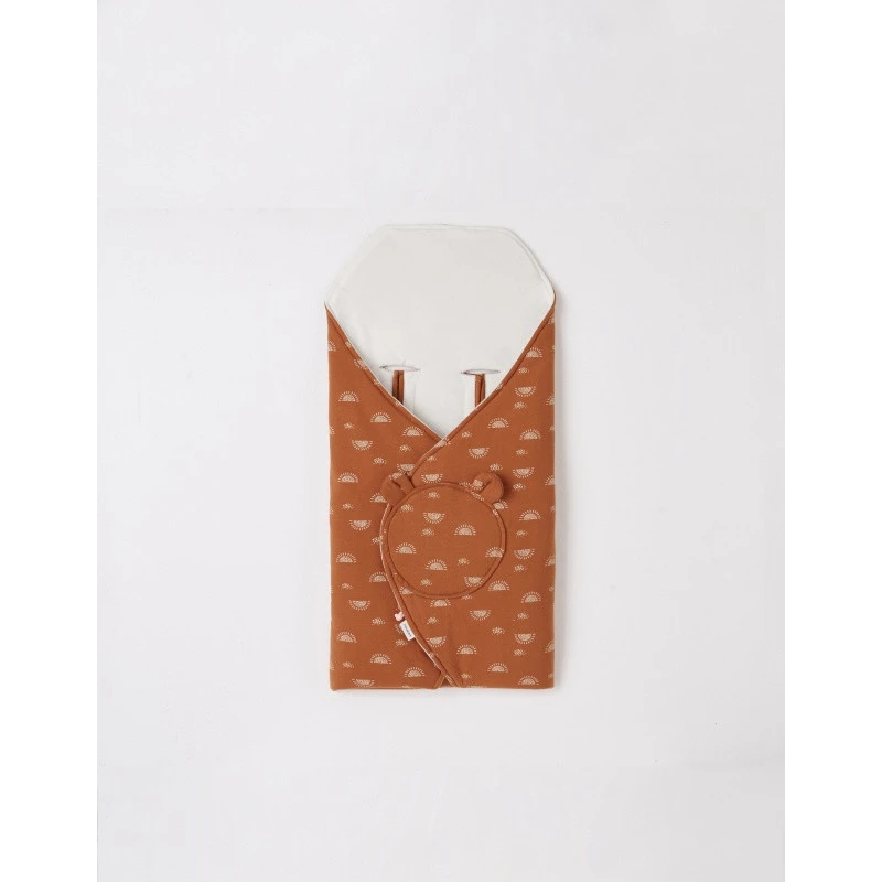 Dans les tons de brique et avec un bel imprimé soleil, la couverture promenade en 100% Coton est idéale durant l’entre-saison car elle recouvre bébé de douceur et le garde bien au chaud, tout en laissant circuler l’air. Son capuchon protégera votre enfant des intempéries et du froid.