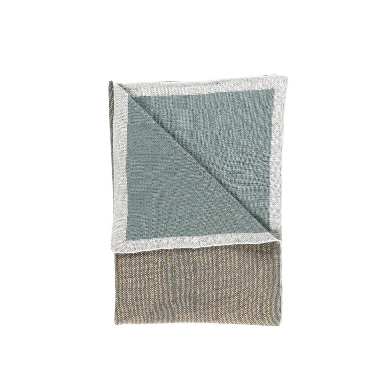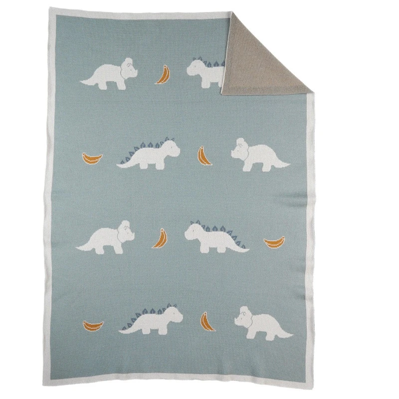 Sur un fond vert eucalyptus, la couverture 75 x 100 cm Tiga, Stegi & Ops de Noukies est parsemée des gentils dinosaures de la collection. Peu encombrant une fois plié, ce joli plaid