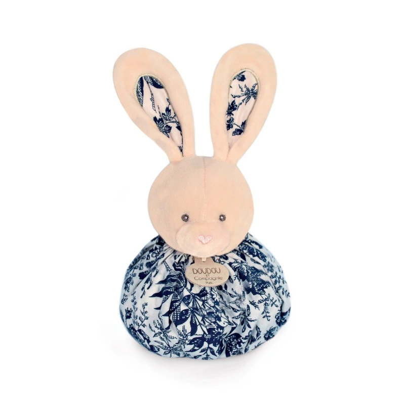 Le lapin boule de la collection Les petits futés de Doudou et Compagnie réunit des matières douces, un tissu uni pelucheux et un imprimé végétal, rappelé jusque dans les oreilles du personnage. La forme souple et plate du doudou le rend facile à prendre en main pour un très jeune enfant, qui en fera vite son compagnon de câlins, de jeux ou de chagrins.