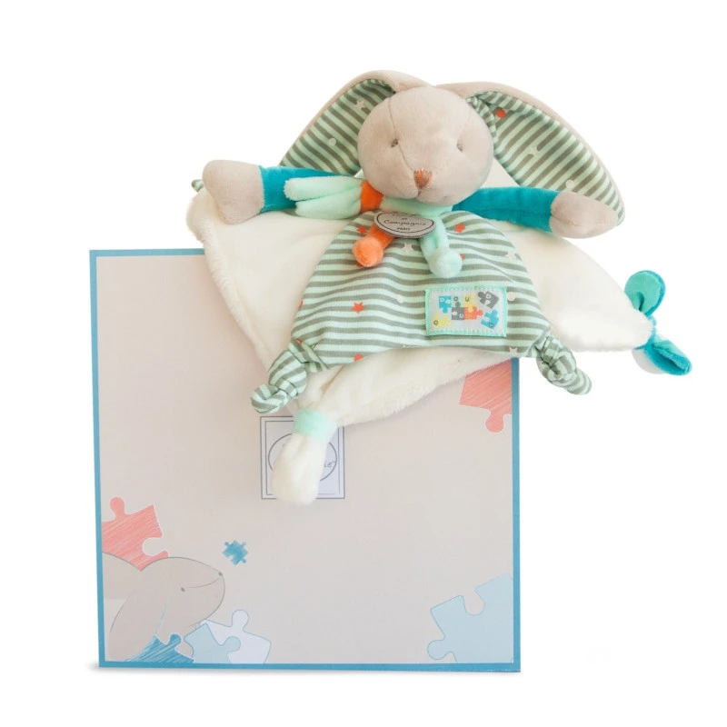 Doudou & Compagnie vous présente son adorable Happy, un lapin bleu et rayé décliné en doudou carré souple pour réconforter et amuser bébé tout au long de la journée. Souple et de taille adaptée aux petites mains de bébé, le doudou Lapin Happy est facile à attraper. Ses grandes oreilles, ses longues pattes et ses petits noeuds sont autant de choses à saisir et à mordiller. Placé dans son joli coffret, le doudou Happy Doudou & Compagnie est le cadeau naissance idéal.