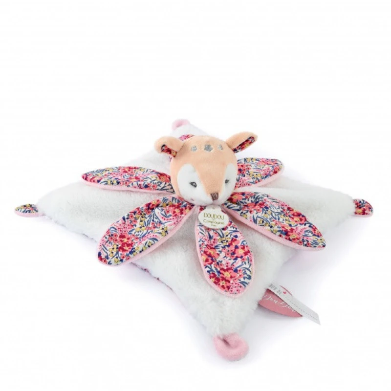 Le doudou Boh’aime de Doudou et Compagnie est plat, souple et facile à saisir par de petites mains. Autour de son cou, sont répartis des « pétales » décorés d’un imprimé floral magnifique, dans des teintes joyeuses et contrastées qui attirent le regard d’un très jeune enfant.