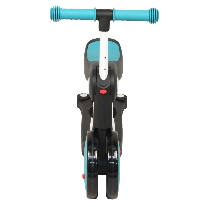 Toutes les transformations se font rapidement, sans outils : un gros bouton pression permet de relever l’assise utilisée en draisienne ou en tricycle, pour y accrocher le guidon ainsi rehaussé. De la même façon, par de simples boutons, les roues solidaires en version 2 roues se séparent et s’écartent pour une meilleure stabilité en version 3 roues.