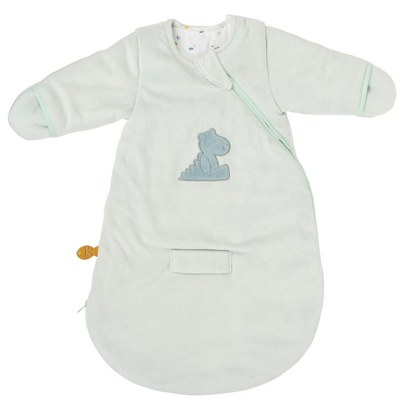 Cette jolie gigoteuse est, en effet, réalisée en velours doux. Elle est équipée de manches terminées par des moufles qui évitent les mains froides, et elle possède un indice de chaleur TOG 2,5, idéal pour les températures de chambre entre 16 et 19 °C.