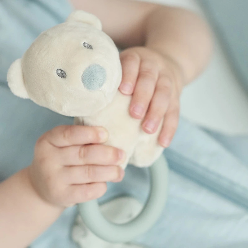 Nattou vous présente un jouet léger, conçu spécialement pour éveiller les plus petits : le hochet Jules l’ours de la collection Roméo, Jules & Sally. C’est l’association réussie d’une ravissante peluche en velours doux et d’un anneau de dentition en silicone qui soulagera les douleurs des premières poussées dentaires !