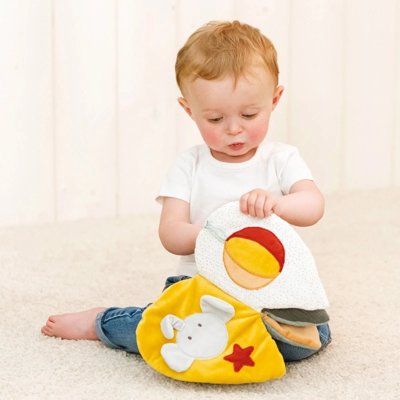 Tout d’abord, le livre d’éveil en tissu Luna & Axel de Nattou associe des teintes vives, pastel, claires ou foncées, des tissus unis ou imprimés afin d’attirer l’œil de bébé, selon le stade de développement de sa vue. Il juxtapose des textures différentes, comme le velours ou la mousseline de coton, qui l’incite à toucher et à découvrir des sensations variées sous les doigts.