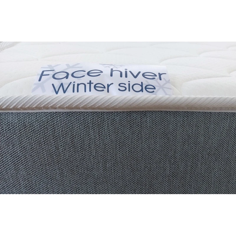 Face hiver : la maille aérée permet une meilleure ventilation du matelas et régule ainsi la sensation de chaleur et face été : le tissu doux en poly coton garantit une sensation de fraîcheur grâce à sa qualité absorbante. Pratique, une bande « face hiver » est cousue sur le matelas et sert à identifier facilement les faces de couchage.