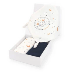 Ce beau coffret est composé d’un lange bleu foncé, d’un second lange décoré d’un superbe imprimé recouvert d’étoiles, de lunes et de planètes et d’un doudou plat carré avec le signe astrologique de bébé ! Extrêmement doux, ils sont fabriqués en mousseline double gaze 100% coton respirant et s’adouciront de plus en plus à chaque lavage. Certifiés Oeko-Tex, ces produits respectent la peau de bébé et ne contiennent aucune substances indésirables.