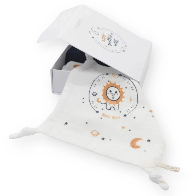 Ce beau coffret est composé d’un lange bleu foncé, d’un second lange décoré d’un superbe imprimé recouvert d’étoiles, de lunes et de planètes et d’un doudou plat carré avec le signe astrologique de bébé ! Extrêmement doux, ils sont fabriqués en mousseline double gaze 100% coton respirant et s’adouciront de plus en plus à chaque lavage. Certifiés Oeko-Tex, ces produits respectent la peau de bébé et ne contiennent aucune substances indésirables.