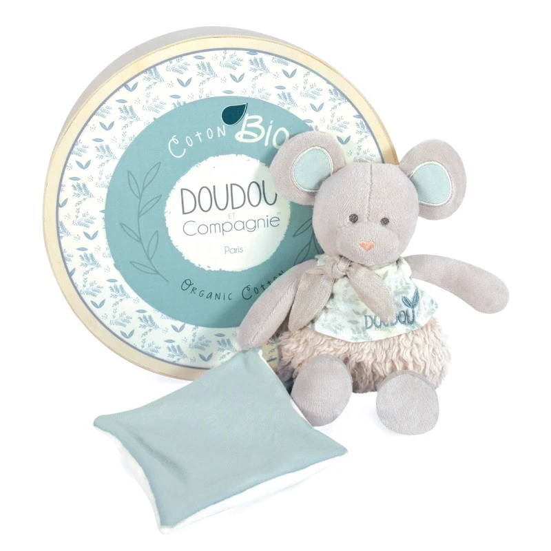 Avec la collection Botanic, Doudou et Compagnie poursuit son engagement en faveur de l’environnement, et propose à nos petits des compagnons rassurants, câlins, composés de matières bio labellisées GOTS pour veiller à leur bien-être… À l’image de ce ravissant pantin-souris de 22 cm.