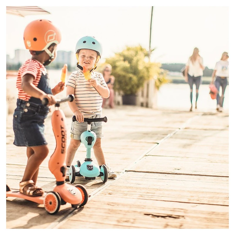 Fière sur sa trottinette et équipé bien évidemment de son casque Scoot and Ride, votre bambin est prêt pour de belles promenades !