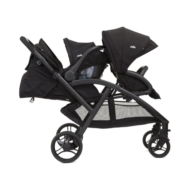 La poussette double Evalite Duo Joie est conçue pour accueillir deux enfants d’âge rapproché. Vous installez le plus petit sur la place arrière, au plus près de vous, soit directement sur l’assise en position la plus allongée, soit sur une coque Joie i-Gemm. Dans ce cas, le siège auto s’accroche par simple click sur la barre de maintien et se verrouille facilement au guidon avec le dispositif de sécurité « Instant Sure Lock » prévu. Quant à la place avant de la poussette, inclinable également, elle convient à votre enfant plus âgé dès qu’il tient assis, c’est à dire vers 6 mois. Chaque siège dispose d‘une capote ajustable, amovible et traitée anti UV UP50+, pour protéger au maximum vos petits des rayons du soleil. C’est parti pour une promenade agréable avec vos bouts de chou !
