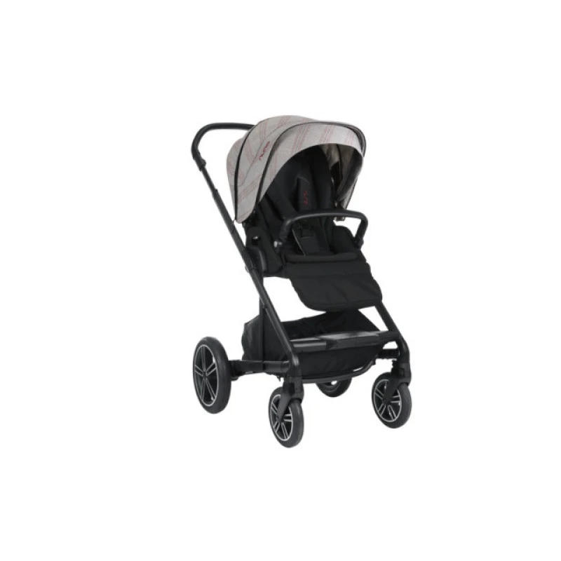 La poussette Mixx next Nuna Ellis mélange harmonieusement une assise noire, une capote rayée et des « cuirs » couleur noir.