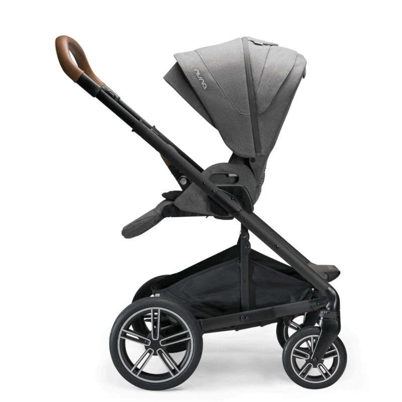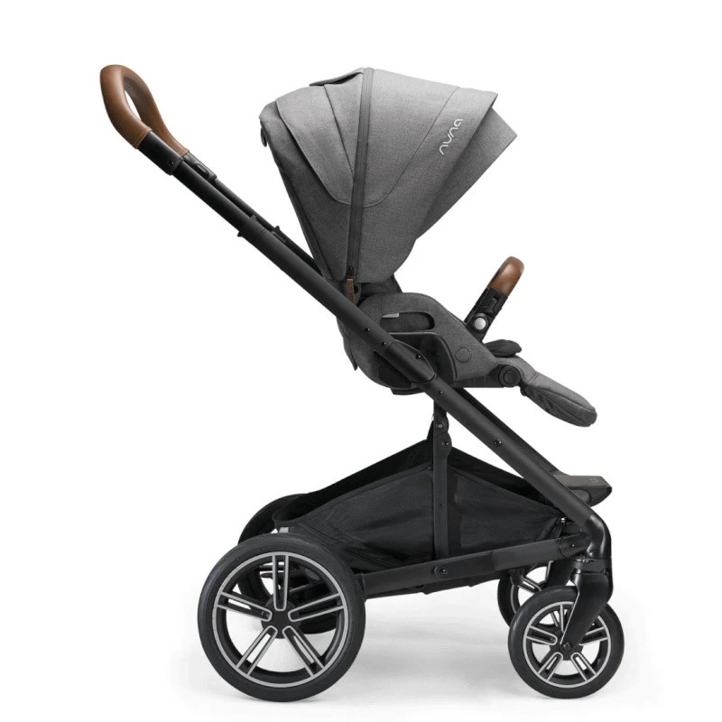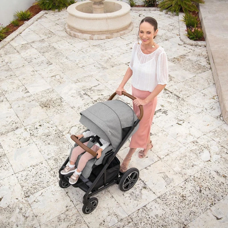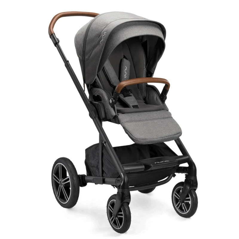 La poussette Mixx next Nuna Mocha mélange harmonieusement une assise grise, une capote mocha et des « cuirs » couleur cognac.