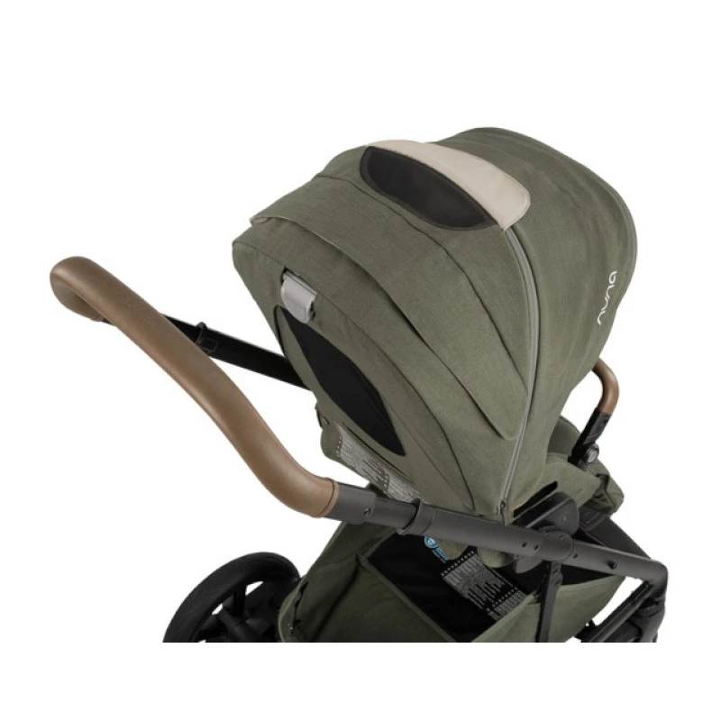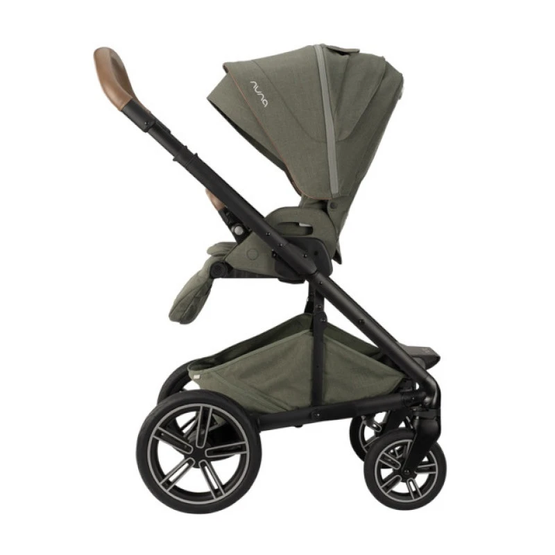 La poussette Mixx next Nuna Mocha mélange harmonieusement une assise grise, une capote mocha et des « cuirs » couleur cognac.