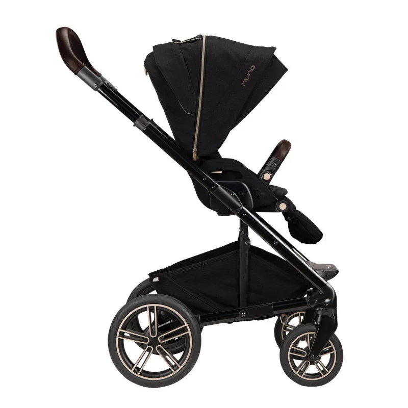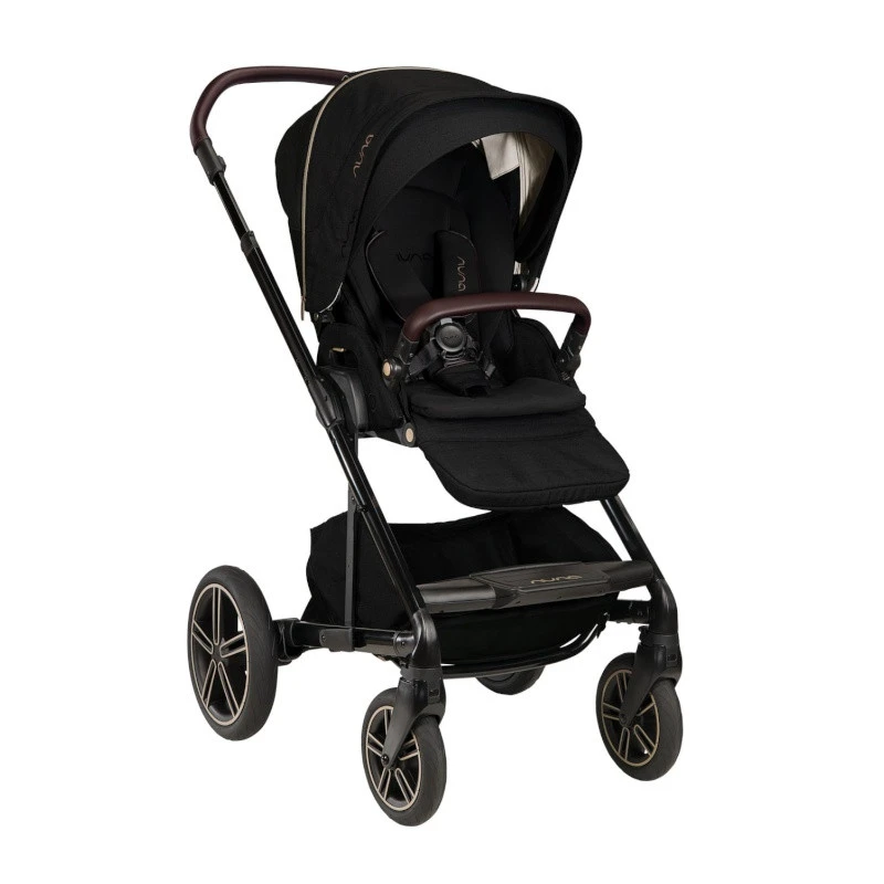 La poussette Mixx next Nuna Riveted mélange harmonieusement une assise et une capote noire et des « cuirs » couleur marron.