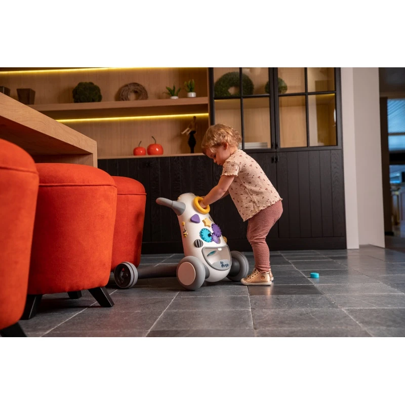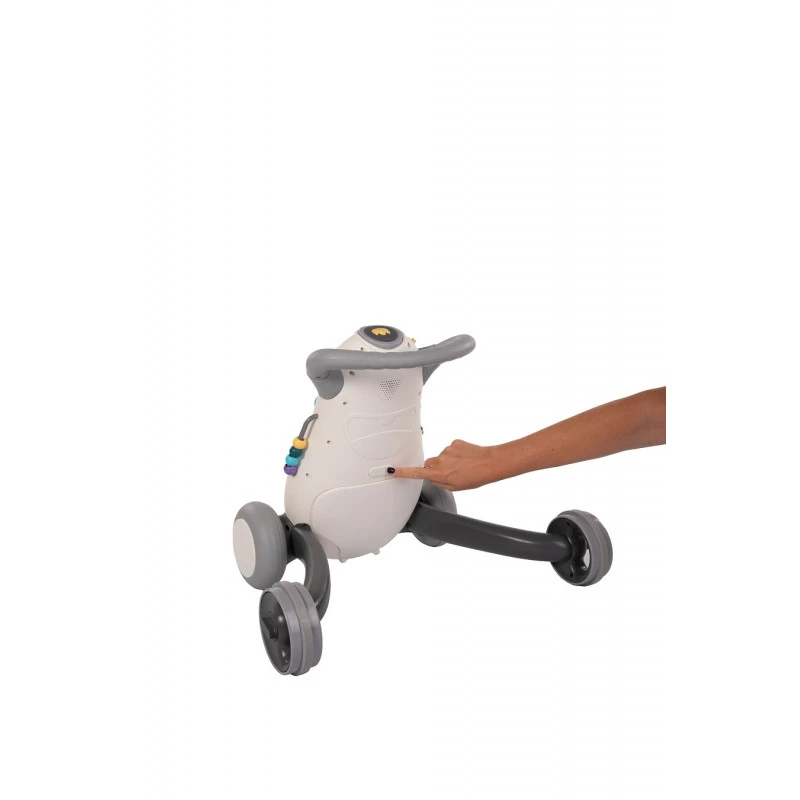 Le pousseur/aide à la marche Jumpy Bo Jungle est aussi un jouet d’éveil sensoriel complet, proposant quantité d’activités variées telles que des engrenages ou une balle à faire tourner, des billes à coulisser, de gros boutons à enfoncer, accompagnées d’une musique dynamique comme encouragement. Il offre également à votre enfant un jeu vraiment rigolo : un entonnoir où faire entrer des balles colorées, qu’il peut ensuite récupérer dans le compartiment « réservoir » juste en dessous. Autant d’activités qui l’aident à coordonner ses gestes et à les rendre de plus en plus précis.