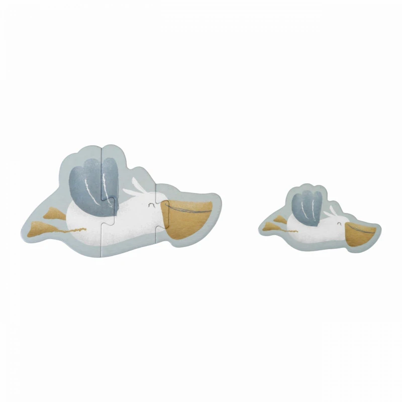 Chaque puzzle Sailors Bay de Little Dutch représente un oiseau, un bateau, un phare, comporte entre 3 et 5 grosses pièces en carton solide, et est accompagné du modèle pour aider votre bout de chou à le reconstituer. Il peut ainsi débuter par la mouette ou le pélican de 3 pièces, se perfectionner avec le voilier ou le bateau de pêche de 4 pièces, devenir expert avec le phare multicolore ou le gros navire de 5 pièces.