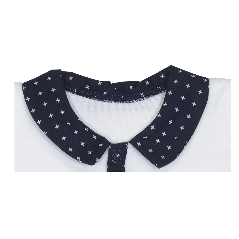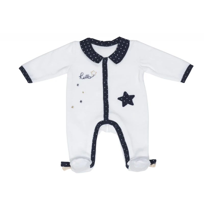 Un beau pyjama en velours pour votre petite prince, assorti au thème Hello par Sauthon pour envelopper bébé dans un cocon de douceur et de chaleur. Pratique, le pyjama Hello présente une ouverture sur l’entrejambe pour faciliter le change et éviter de refroidir bébé ainsi qu’une ouverture devant pour qu’habiller bébé soit le plus simple possible. Décliné en blanc neige avec un liseré bleu marine, ce pyjama pour petit garçon est orné d’un col pointu et d’une délicate broderie avec de jolies petites étoiles! Grace à ses manches longues et ses matières douces et chaudes, bébé passera de bonnes nuits bien emmitouflé !