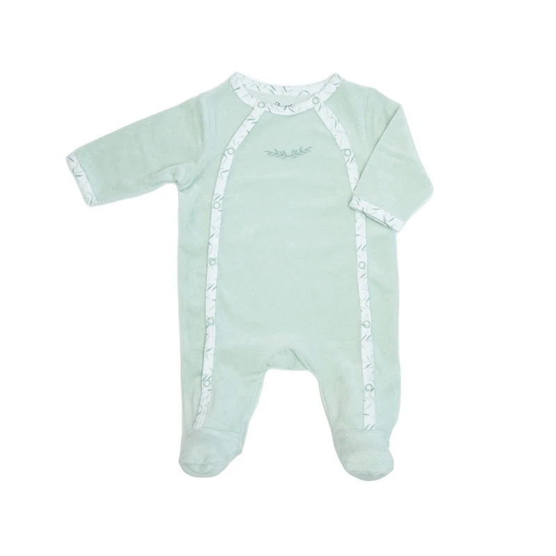 Le pyjama Filou de Domiva est réalisé en velours moelleux, composé à 75 % de coton et à 25 % de polyester. Il est proposé dans une tendre couleur vert sauge, il est bordé d’un biais imprimé et décoré sur le plastron de feuillages délicats, qui procurent au vêtement une touche de raffinement.