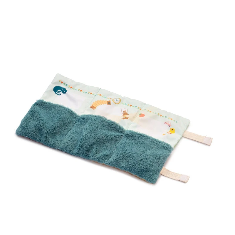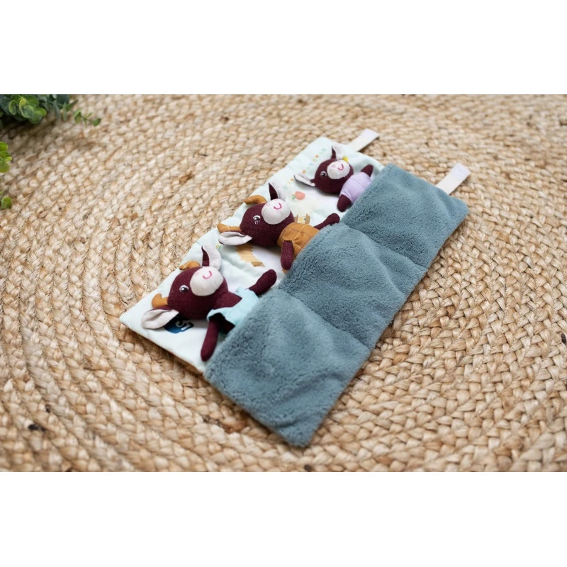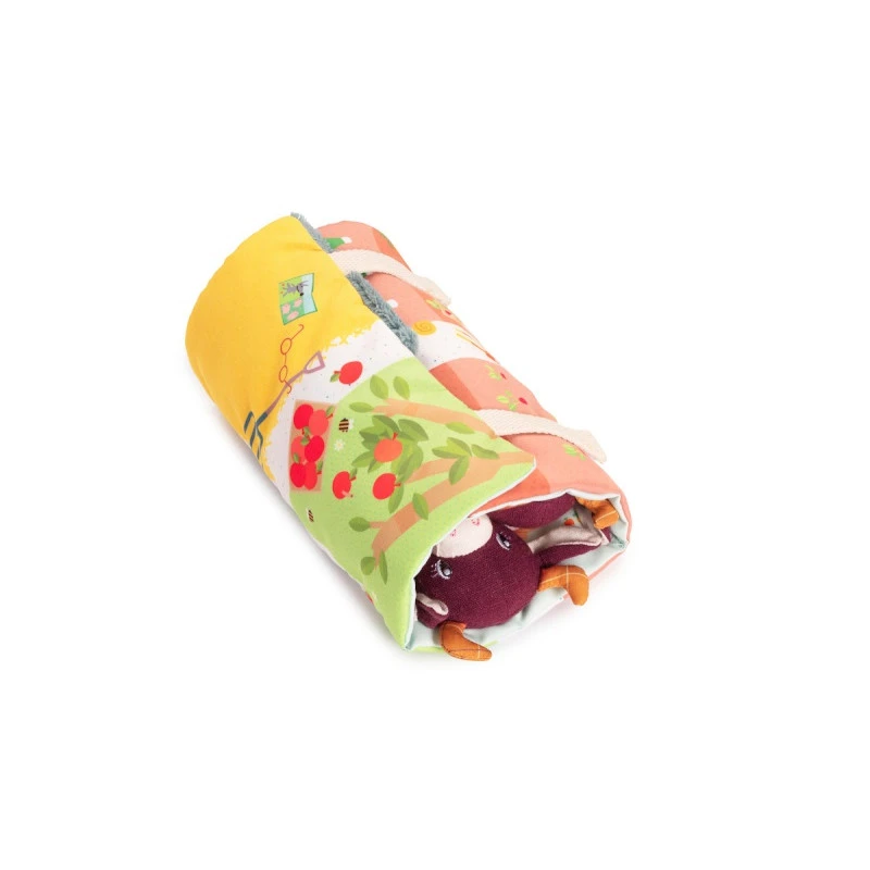 Sur la première face du tapis, les 3 mini-personnages des Lilliputiens évoluent à la ferme : au potager, au verger ou au bord de la mare. Sur l’autre face, la famille de Rosalie, épuisée par sa journée au grand air, retrouve son lit douillet pour une bonne nuit de sommeil. Mais attention, votre enfant doit déshabiller ses petits amis avant de les coucher !