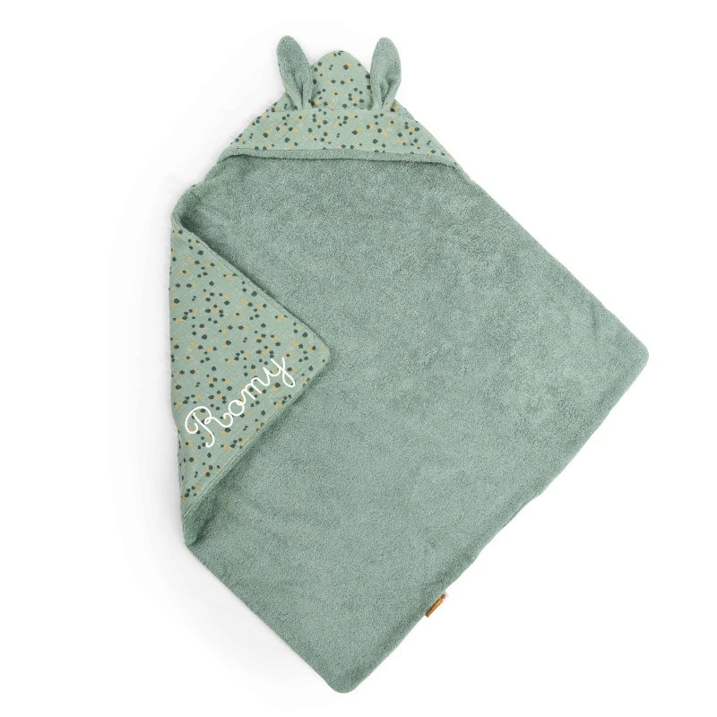 Elle est composée uniquement de coton, en éponge bouclette et lange imprimé, certifié GOTS. Sa capuche est décorée d’une adorable tête de lapin ! Petit plus : elle peut être brodée au prénom de l’enfant (en option).