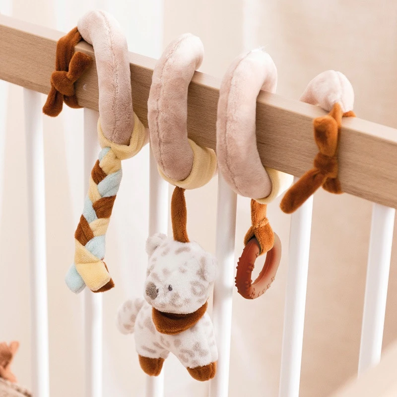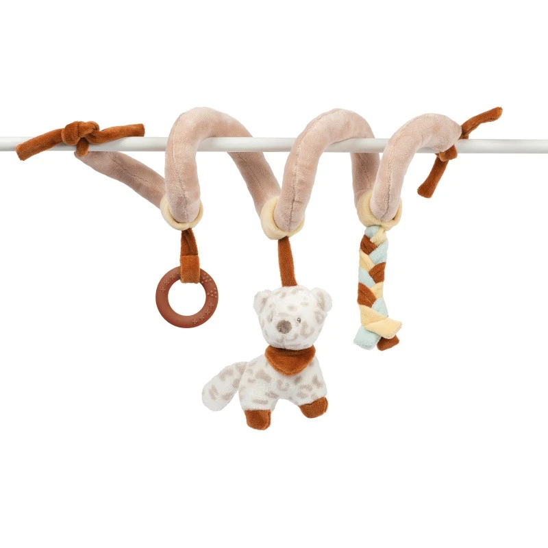 - 3 activités suspendues : un anneau de dentition, une tresse colorée, un léopard des neiges ravissant.