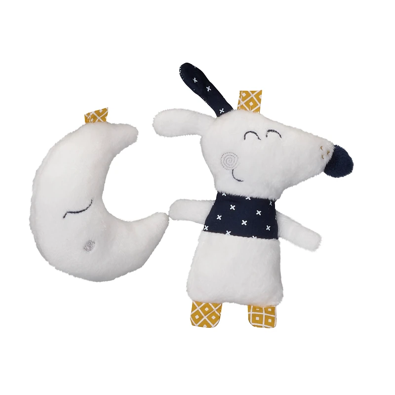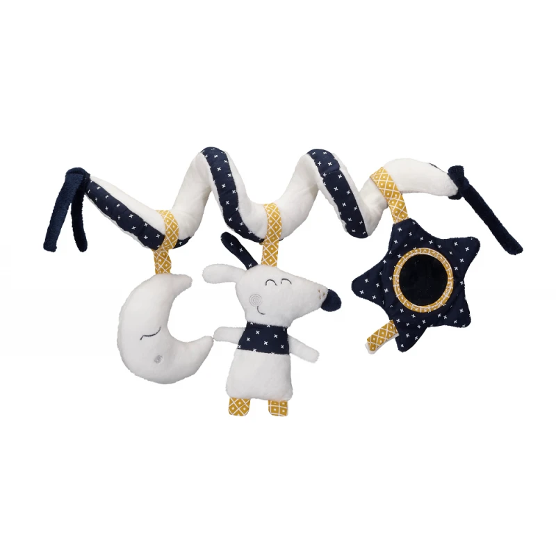 Cette jolie spirale d’activités ludique assortie au thème Hello par Sauthon se fixe facilement aux barreaux du lit et du parc, à l’anse du siège-auto ou de la nacelle ou encore à la poussette grâce à sa forme particulière et ses velcros. Dans les tons de bleu marine, blanc et jaune, on y retrouve tous les personnages du thème sous forme de petites peluches toutes douces : la jolie petite souris, une lune blanche et un petit miroir en forme d’étoile que bébé adorera regarder. Ses couleurs contrastées sont idéales pour l’éveil de bébé ! Cette spirale favorise l’éveil de votre enfant, il s’amusera à en regarder tous les détails, les formes et les couleurs.