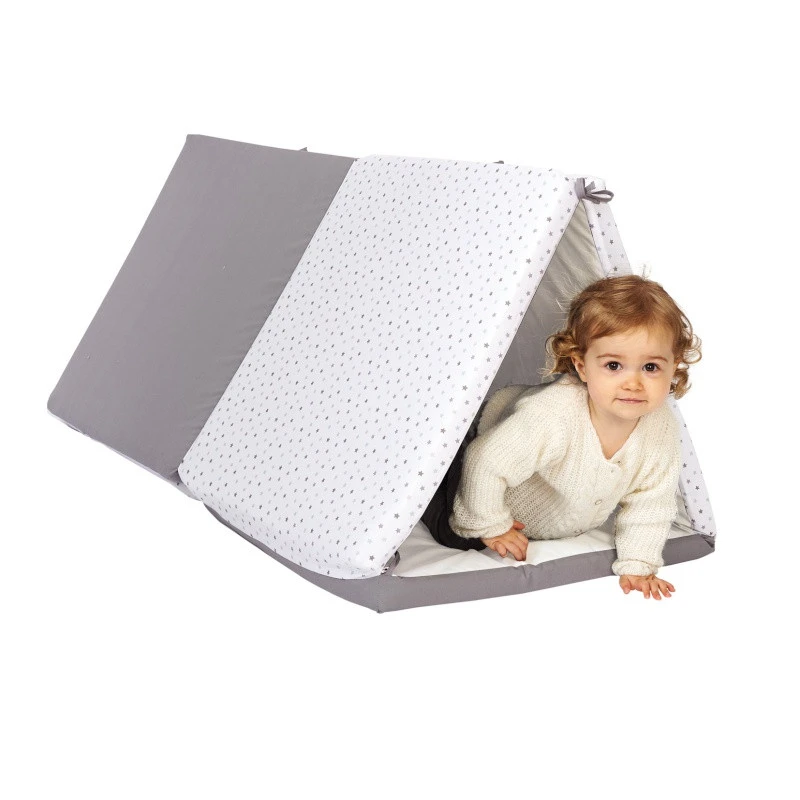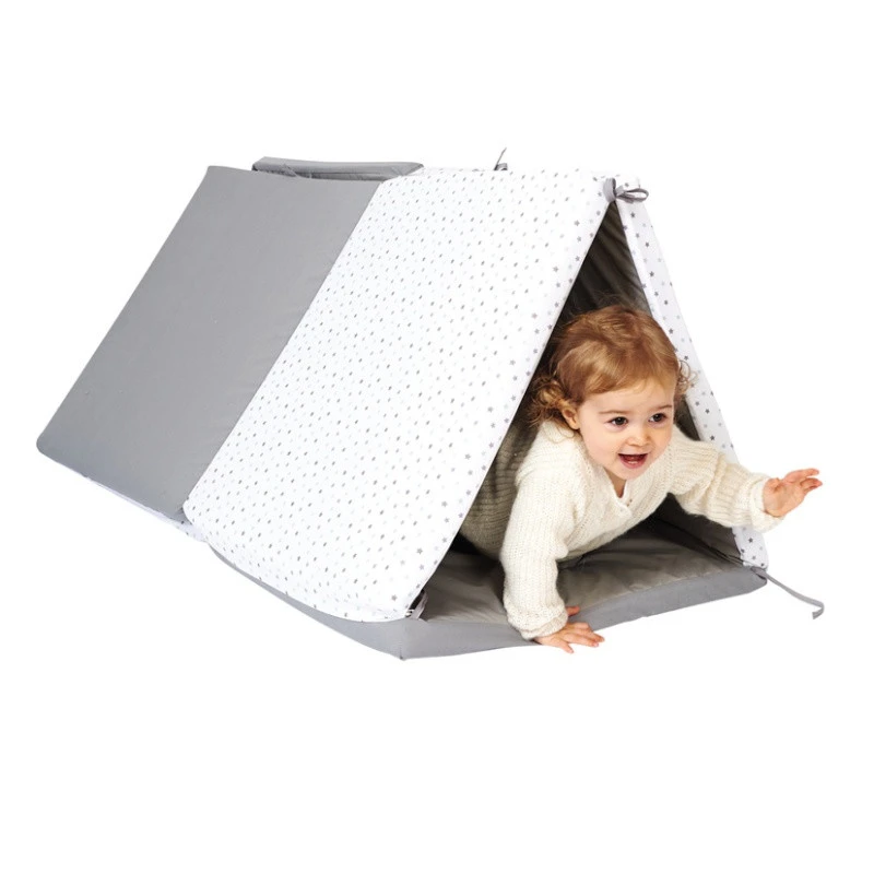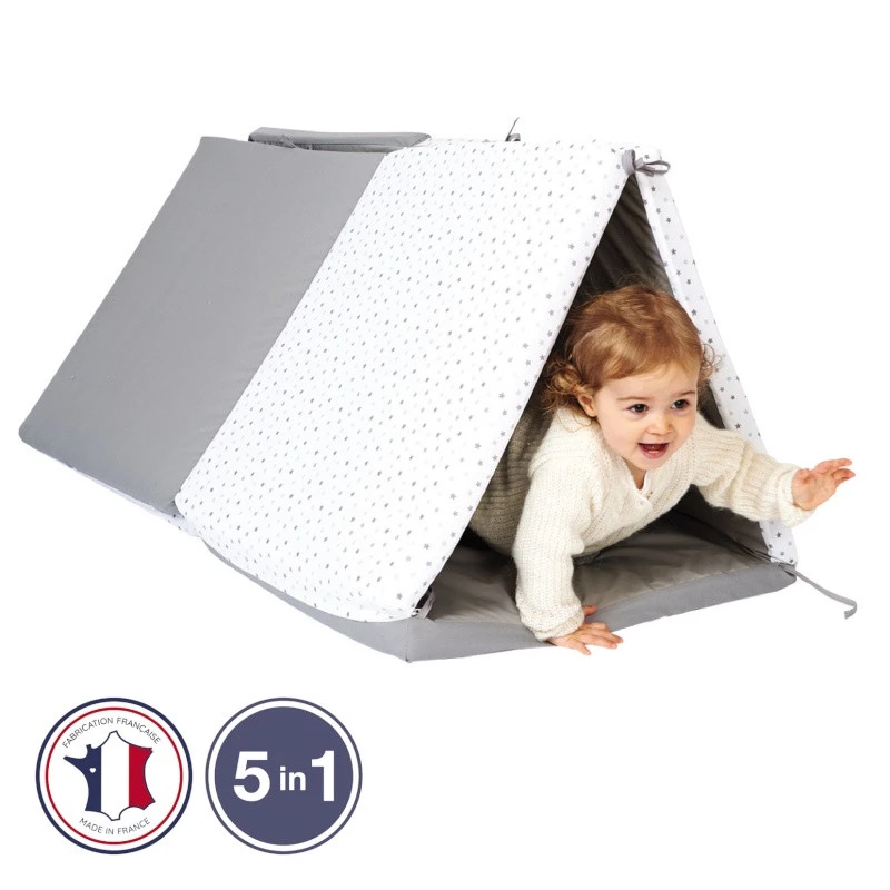 Grâce à un système de pliage spécifique, le tapis évolue en tunnel ou en cabane, et offre à votre bout de chou de nouvelles occasions de jeux.