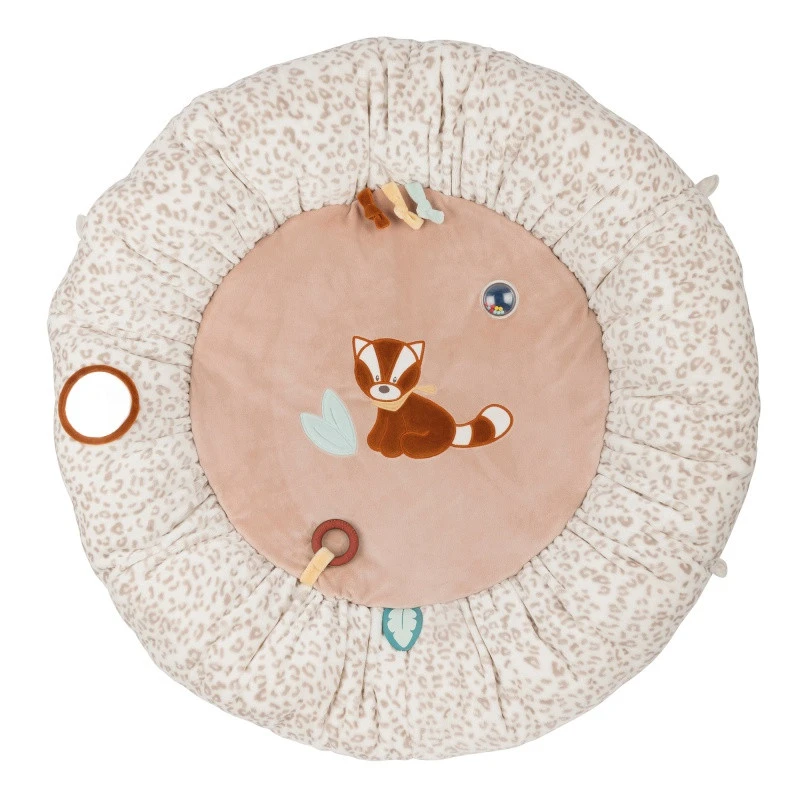 Le tapis-pouf Boris & Jungo de Nattou est extrêmement doux, bien rembourré, et accueille volontiers votre bébé sur le ventre s’il veut explorer les activités proposées sous ses yeux : le miroir, l’anneau de dentition, les billes colorées, les petits nœuds… Tout en jouant, il stimule ses sens, sa motricité, et améliore sa tonicité musculaire.