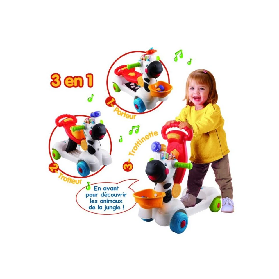- 3 fonctions évolutives : trotteur (12 mois et +), porteur (18 mois et +) et trottinette (24 mois et +).
